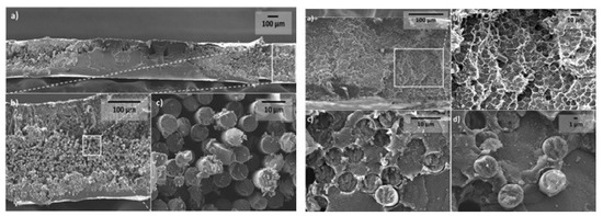 Fracture surfaces of AgNWs modified CF/PEKK laminates fabricated by film stacking method showing poor matrix impregnation with voids (left) and powder impregnation method showing improved matrix impregnation with no voids (right) at different magnifications (reprinted with permission) [52].