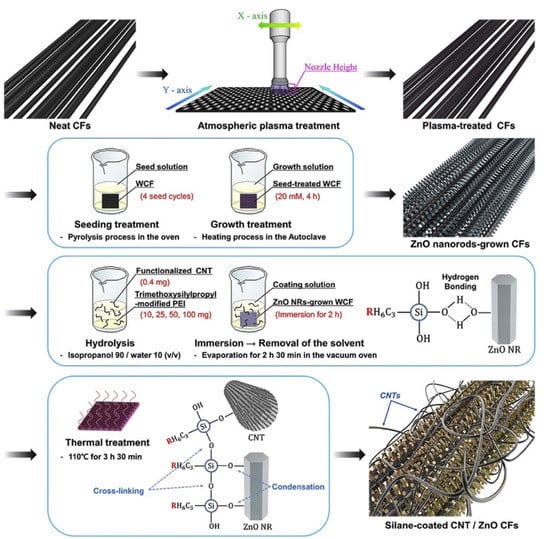 Processing schematics of ZnO NRs growth, CNTs-modified silane coating on CF surface (reprinted with permission) [54].