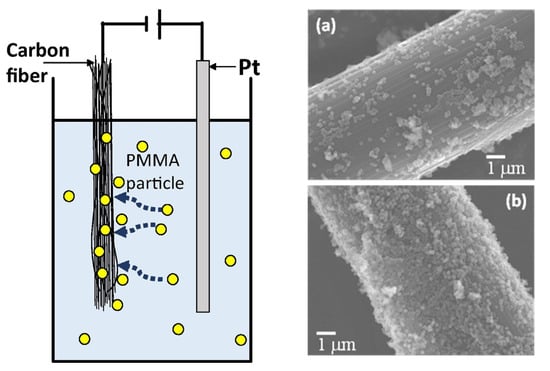 - Yamamoto, T.; Uematsu, K.; Irisawa, T.; Tanabe, Y. Controlling of the interfacial shear strength between thermoplastic resin and carbon fiber by adsorbing polymer particles on carbon fiber using electrophoresis. Compos. Part A Appl. Sci. Manuf. 2016, 88, 75–78. [Google Scholar] [CrossRef]
