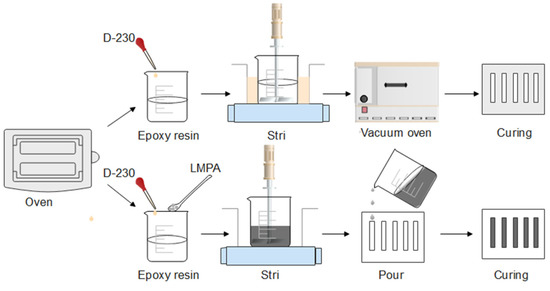 For the preparation of EP, the E-51 was placed in a beaker and heated up to 60 °C using an oven. The D-230 was then added to the beaker, and the mass ratio of E-51 to D-230 was 3:1. Then, the mixture was transferred to an oil bath at 60 °C and stirred at 300 rpm for 10 min. The vacuum oven was heated to 60 °C, and the mixture was placed in the vacuum oven for degassing for 10 min. Finally, the mixture was poured into a mold and cured, as shown in Figure 3.