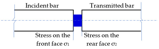 where and are the stress on the front and rear faces of the specimen, respectively; , , and are the incident, reflected, and transmitted waves, respectively; is the cross-sectional area of the specimen; and E are the cross-sectional area and Young’s modulus of the pressure bar, respectively.