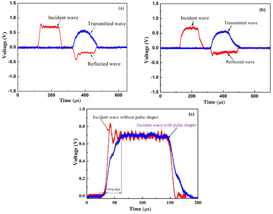 The typical stress waves without/with the pulse shaper are shown in Figure 7, and it can be seen from Figure 7c that the pulse shaper not only induced a rising edge of 30 μs but also filtered the high-frequency component of the stress wave, which can ensure the stress equilibrium in the specimen. Moreover, there was a disturbance in the incident wave with the pulse shaper. We considered that it was probably caused by the manufacturing defect of the pulse shaper surface, which resulted in an unstable deformation during the impact between the striker bar and incident bar. In addition, un-alignment of the bars can also result in a disturbance in the stress wave, which has been reported by Wu et al. [45].