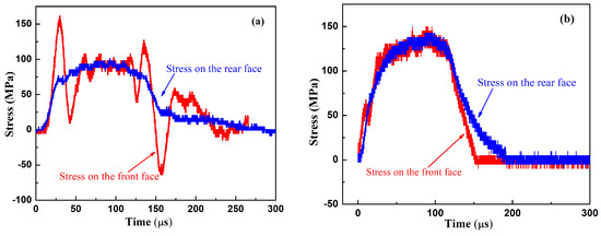 As shown in Figure 6, the stresses on the front and rear faces of the specimen can be calculated according to the following formula to demonstrate the uniformity of stress in the specimen [42,43,44]: