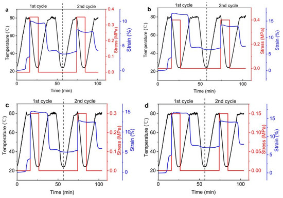 Figure 9b–d show the stress–strain–temperature behavior for the 10%, 30%, and 50% LMPA/EP composites; the second cycle mechanical deformation is about 14%, which exceeds the deformation of the EP, and the deformation increases with increasing fraction of the LMPA. The corresponding shape recovery ratios are 95.7%, 95.5%, and 94.7%, and the shape fixity ratios are 96.6%, 97.2%, and 98.1% after the second cycle, respectively.