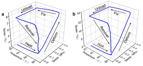 Figure 10 illustrates the three-dimensional SME data of the second shape memory cycle of EP and 10 vol% LMPA/EP, reflecting the curves of stress–strain–temperature. It can be seen in Figure 10a,b that the shape memory cycle is divided into five stages: (1) heating to switch temperature, (2) deforming by applying a force, (3) cooling to make temporary shape fixed, (4) stress unloading, and (5) reheating to recover strain. Figure 9 illustrates each stage of the shape memory test, and it is clearly observed that the recovery of strain at the transition temperature is a rapid process.