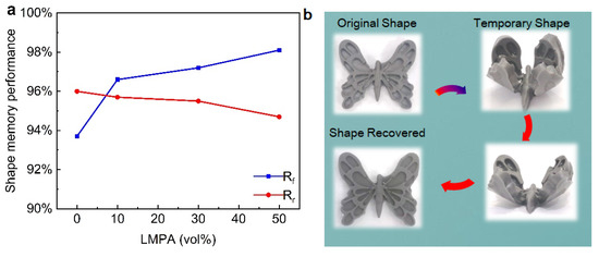 Figure 11a illustrates the effect of LMPA content on the shape fixity ratio and the shape recovery ratio, and the corresponding parameters value is shown in Table 1. As shown in Figure 11a, it is clear that there is a slight decrease in the shape recovery ratio, but there is an obvious increase in the shape fixity ratio with increasing volume fraction of the LMPA. It is clear that LMPA does not have a contribution to the shape memory performance, but it is easy to achieve a phase exchange between solid and liquid by varying the temperature. Moreover, LMPA can also enhance the stiffness of the LMPA/EP composites. Thus, the shape fixity ratio is dominated by the LMPA additive, and the shape recovery ratio is determined by the epoxy resin volume fraction. Figure 11b shows a typical shape recovery process of a butterfly made by 30 vol.% LMPA/EP composites, which can return to its original shape in only 5 s.