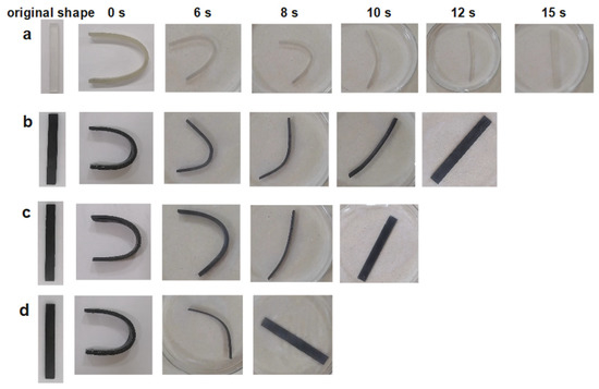 Moreover, to evaluate the accurate shape recovery time, a rectangular strip with dimensions of 80 mm × 10 mm × 2 mm was made by the LMPA/EP composites, as shown in Figure 12. It is clear that the shape recovery time is improved with increasing LMPA content. The time of the complete recovery for the EP, 10% LMPA/EP, 30% LMPA/EP, and 50% LMPA/EP is 15 s, 12 s, 10 s, and 8 s, respectively. The additive of the LMPA can improve the recovery process of LMPA/EP composites efficiently.