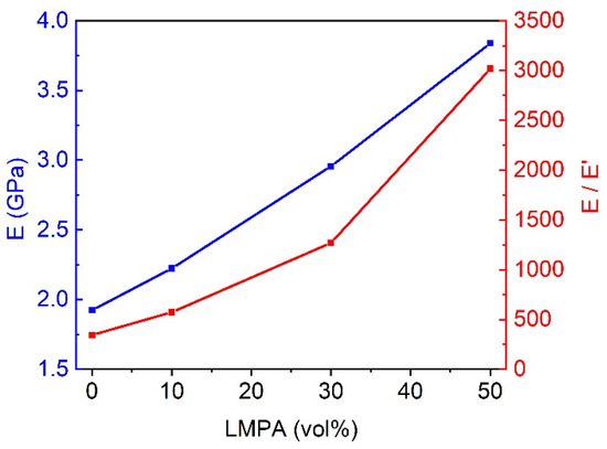 Figure 14 shows the influence of LMPA content on the modulus of the glassy state (30 °C) and the ratio of the modulus of the glassy state to rubber state (80 °C). As shown in Figure 14, for the temperature of 30 °C (T > Tg), the storage modulus (E) of composites grows linearly with augmented LMPA content, and the storage modulus (E) changes from 1.92 GPa to 3.84 GPa, which demonstrates that the LMPA has a significant contribution to the enhancement of the storage modulus. For the temperature of 80 °C (T > Tg), the storage modulus (E’) of composites decreases slightly. It is clear that the storage modulus ratio (E/E’) varies in the range from ≈400 to over ≈3000. Thus, the addition of LMPA amplifies the storage modulus of the glass state and reduces the modulus of the rubber state, which means that the tunable stiffness of the composites is expanded.