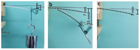 In order to demonstrate the variable stiffness influenced by the LMPA, the deflection deformation test of the cantilever beam was performed, and the beam was made by the EP and 30 vol% LMPA/EP. The size of the beam is 80 mm × 10 mm × 2 mm, as shown in Figure 15. At room temperature, the deflection of neat EP under a load of 200 g is 10 mm, which is larger than the 3 mm deflection of the LMPA/EP beam (Figure 15a,d). The deflection test also verifies that the stiffness of the LMPA/EP beam is larger than that of neat EP, which means the addition of LMPA increases the stiffness. However, when the ambient temperature is heated up to 80 °C, the deflection of the LMPA/EP beam is 25 mm under the self-weight loading, which is much larger than that of the EP beam (7 mm), which means that the stiffness of LMPA/EP decreases at high temperature (as shown in Figure 15b,e). If a clamper as a load were to act on the beam, the deflection of the LMPA/EP beam would increase to 60 mm. The larger the deflection, the softer the material, which also means the less rigid the material. Deflection experiments also confirmed that the stiffness of the LMPA/EP composite is higher than that of the neat EP at room temperature and much lower than that of neat EP above the transition temperature. Finally, the beam was cooled to room temperature and the load of the clamper was removed, meaning that the beam can return to the position at 80 °C (as shown in Figure 15c,f).