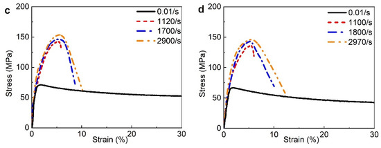 Figure 16 illustrates the stress–strain curves of the LMPA/EP composites at various strain rates. Figure 16a–d correspond to the stress–strain curves of the EP, 10%, 30%, and 50% LMPA/EP. It is clear that there is a significant difference in the flow stress between the quasi-static and high-strain-rate load cases, and the flow stress increases obviously at high strain rates compared to the quasi-static load case. Generally, the peak stress under quasi-static load is about 70 MPa; however, the peak stress at high strain rate is about 140~170 MPa, which indicates that the flow stress of the LMPA/EP composites is sensitive to the strain rate. In addition, the flow stress at high strain rate also increases with strain rate, but such an increasing tendency is slow with the increase in the strain rate.