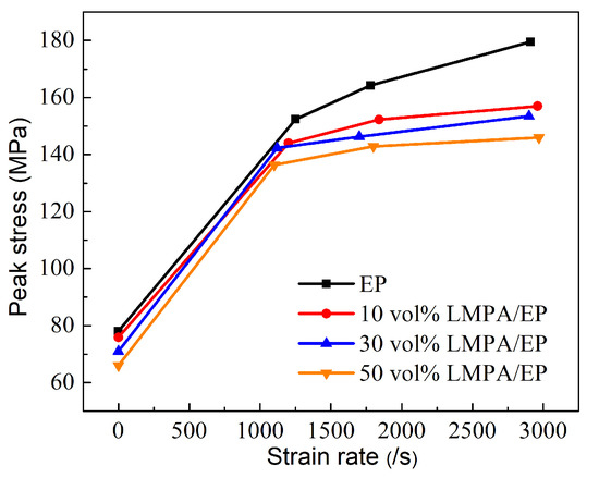 The variations in the peak stress of the composites with the strain rate are shown in Figure 17. It can be observed from Figure 16 that the peak stress of the composites increases with the increasing strain rate, but the increasing amplitude decreases with the increase in the LMPA content, which is due to the heat softening converted by the plastic work at high strain rates. The heat generated by plastic work can be calculated by , and α is the coefficient of the heat generated by plastic work. Similar works have been reported by Tan [44] and Arruda [48]. The melting point of the LMPA is about 47 °C, and the local temperature rise in the composites would be larger than this melting point of 47 °C [48]. When the LMPA is in melting status, it would not suffer a load anymore. Thus, the maximum of the stress would reach a saturated status. Moreover, the peak stress of the LMPA/EP composites decreases with increasing LMPA volume fraction. For such LMPA/EP composites, it can be considered as a foam EP matrix filled with LMPA. With the LMPA content increasing, the foam EP matrix would be high porosity, which has a low strength. Thus, the peak stress of the LMPA/EP composites decreases with increasing volume fraction of the LMPA.