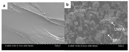 Based on the macro-failure modes in Figure 18, in order to explain the deformation mechanism more clearly, the SEM tests were performed on the specimen before and after SHPB tests, as shown in Figure 18. For the specimen before the SHPB tests, Figure 19a,b show the SEM graphs of the typical microstructure of the EP and PCL/EP composites. The SEM graph of the EP shows a homogeneous distribution, and there is no pore or cavity defect in the EP, as shown in Figure 19a. Figure 19b shows the dispersion of LMPA in the matrix; the spherical particles are LMPA. It is obvious that the LMPA is distributed in the epoxy resin matrix uniformly, which can ensure the reliable performance of the LMPA/EP composites.