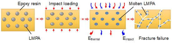 In the following work, the deformation mechanism of the LMPA/EP composites at high strain rate is discussed, and the corresponding schematic graph is also shown in Figure 20. Under quasi-static compression, the molecular chains in the epoxy resin matrix have sufficient time orientation, which ensures the excellent plastic deformation; under dynamic compression, the duration of the impact load pulse is very short (~200 μs), and the heat generated by the plastic work cannot be diffused, which can be considered as adiabatic compression, which would make the LMPA molten. In addition, the molten LMPA is in the liquid phase, which cannot bear the load anymore, and the external load would be burdened by the epoxy resin matrix. Based on the SEM graph of LMPA/EP composites in Figure 19b, it can be observed that the epoxy resin matrix is filled with the LMPA particles. Thus, the epoxy resin matrix can be considered as a porous structure material, and the LMPA fills these holes in the epoxy resin matrix. When the LMPA is molten by the heat converted by the plastic work at high strain rate, the porous epoxy resin matrix would bear the impact loading. Finally, the hole wall of the porous structure fails, and the molten LMPA covers the fracture surface of the epoxy resin matrix, which corresponds to the fracture failure mode and molten phenomena of the LMPA in Figure 18 and Figure 19c–e. It also indicates that the LMPA/EP composites are more suitable for low-strain-rate service environments due to its excellent plastic deformation under quasi-static compression compared to the dynamic load case.