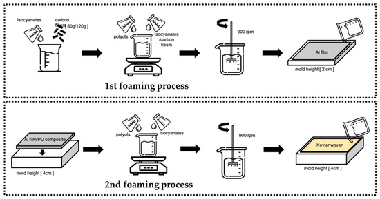 Kevlar woven fabrics (TORAYCA™, Taiwan) have a yarn fineness being 3000 filaments/strand, a warp density being 12.5 ends/inch, and a weft density being 12.5 picks/inch. The high-density soft PU foam agent A is polyester polyol while the hardener agent B is isocyanate (Kuang Lung Shing Corporation, Taoyuan City, Taiwan). Carbon fibers (HTS 40, TORAYCA™, Kaohsiung City, Taiwan) have a length of 6.2 mm and a diameter of 7 μm. PET aluminum films are purchased from General Horng Corporation, Taiwan.
