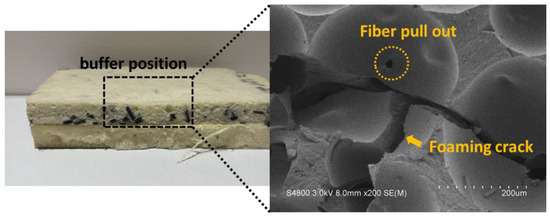 Figure 4 shows the damaged samples after the buffer absorption test along with the impact site where the impactor strikes. The test results indicate that the PU foam composite recovers to its primary state, which means there is little difference in the damage sites after the sample is damaged. The phenomenon is attributed to the elastic recovery of soft PU foam that demonstrates comparatively greater durability and better energy absorption than the solid materials (e.g., metal or plastic). The SEM image shows ruptured cells of the damage site. As for a multi-layered structure, PU foam layer provides the buffer efficacy and the fiber layer (reinforcement) confine the crack expansion. A small amount of fibers are dispersed in the PU foam in a non-continuous phase, and they are randomly distributed among cells. When encountering the spread of cracks, fibers stop them from exacerbation. Despite exhibiting cracks, cells are reinforced as a result of the incorporation of carbon fibers. Subsequently, the improved rigidness of whole material is beneficial to the loading support, which confines the damage rendered to the cells and cells eventually sustain the original structure.