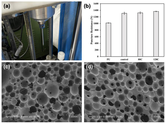 Figure 2 shows the images of PU foam composites as related to the content of carbon fibers. Figure 2a shows the 40-mm thick pure PU foam with an even foaming structure as well as the experimental groups (PU foam composites)-80C and 120C with a sandwich structure. The 80C and 120C composites have lamination layers of an aluminum film, PU foam with carbon fibers, a Kevlar woven fabric, PU foam, and an aluminum film in order. The foaming results differ for 80C and 120C groups due to the fiber content. A rise in the carbon fibers has a positive influence over the foaming density but limiting the foaming space that fibers are embedded in PU foam. The 120C group exhibits that the carbon fibers enter to another lamination layer as they are forced by the foaming pressure. Figure 2b,c show the morphology when the top aluminum films are removed from the experimental groups. The fillers and carbon fibers are well distributed and saturated in the PU foam layer, and the interfaces show that the two materials are perfectly bonded. Figure 2d,e display the PU foam as related to the magnification rate, suggesting that chemical foaming leads to the typical close-cell type porous structure with an even pore size distribution.