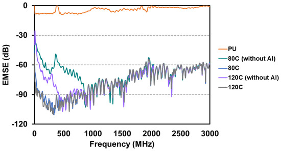 As specified in ASTM D4935-10, the coaxial transmission fixture and spectrum analyzer (KC901S, TS RF Instruments Co., Ltd., Taoyuan City, Taiwan) are used to measure the EMSE of samples in a frequency range of 100 KHz~3 GHz. A blank sample with an identical thickness serves as the reference sample and its EMSE is recorded as SERef, according to which the tester is rectified. Samples have a size of 150 mm × 150 mm. Ten samples from each specification are used for an average.