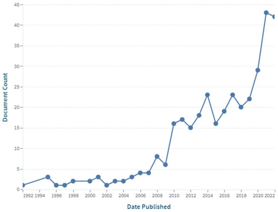 The number of publications with the keyword “cellulose–chitosan” (in the abstract) over time (source: www.lens.org; accessed on 21 December 2022).