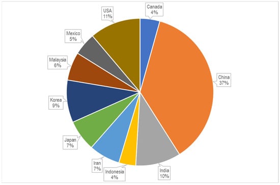 Shares of publications per country or region (source: www.lens.org; accessed on 21 December 2022).