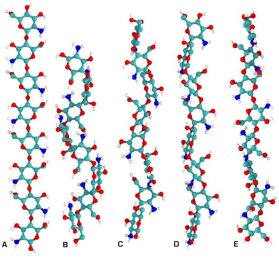 Chitosan secondary structures as determined by solid X-ray crystallography. (A) Two-fold; (B) three-fold; (C) four-fold; (D) five-fold; (E) two-relaxed-fold [40].