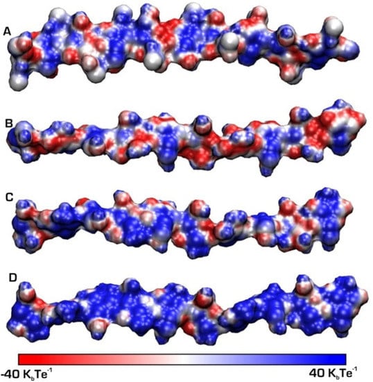 Chitin and chitosan chains simulated at different pH values: (A) chitin and (B) chitosan at basic (pH = 10), (C) chitosan circumneutral (pH = 6.5), (D) chitosan acid (pH = 3.5). A positive charge is represented by patches in blue [40].