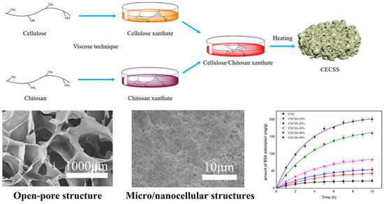 Schematic presentation of cellulose chitosan composite sponge formation with the micrographs of the sponges’ open-pore structure and the influence of chitosan content onto BSA adsorption efficiency. Reprinted (adapted) with permission from Liu, C.; Yu, J.; You, J.; Wang, Z.; Zhang, M.; Shi, L.; Zhuang, X. Cellulose/Chitosan Composite Sponge for Efficient Protein Adsorption. Industrial & Engineering Chemistry Research 2021, 60, 9159–9166 [81]. Copyright 2021 American Chemical Society.