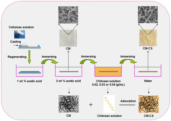 - Cao, Z.; Luo, X.; Zhang, H.; Fu, Z.; Shen, Z.; Cai, N.; Xue, Y.; Yu, F. A facile and green strategy for the preparation of porous chitosan-coated cellulose composite membranes for potential applications as wound dressing. Cellulose 2016, 23, 1349–1361. [Google Scholar] [CrossRef]