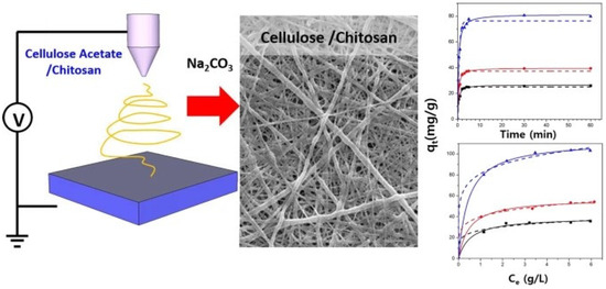 - Aquino, R.R.; Tolentino, M.S.; Amen, S.C.S.; Arceo, M.A.V.; Dolojan, M.E.S.; Basilia, B.A. Preparation of cellulose acetate blended with chitosan nanostructured membrane via electrospinning for Cd2+ adsorption in artificial wastewater. In Proceedings of the 4th International Conference on Water Resource and Environment (Wre 2018), Kaohsiung City, Taiwan, 17–21 July 2018; Volume 191, p. 012137. [Google Scholar] [CrossRef]