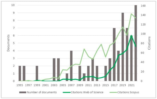 Number of publications and citations per year for the 75 documents, according to Scopus and Web of Science (1995–2022).