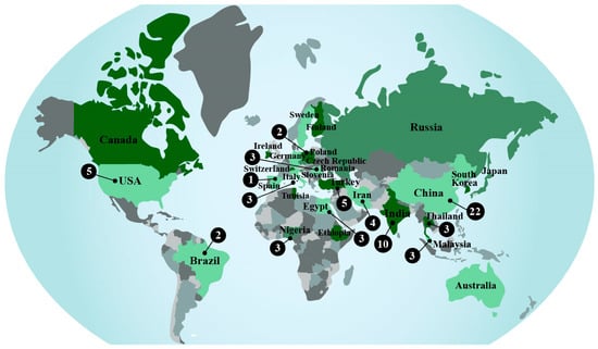 Concerning geographic representation, 30 countries have published on the subject, with at least one from each of the five continents (Figure 3). The most represented country is China (22), followed by India (10), the USA (5), Turkey (5), and Iran (4), while the other countries have three or fewer documents. All these countries have less than 100 citations in their published documents, but the USA has the most cited paper in the scientific literature (Table 3). Also, collaborative research was identified among the countries sharing the same publication. For example, India with Ethiopia and Ireland [42], China with Switzerland [15], and Italy with Russia [43]. China has published on this subject over the last 20 years, while most countries have just started investigating the topic since half of the documents were published after 2017. Furthermore, over 50% of the world has not published on this subject yet since the publication list only includes 15% of the world’s countries. This indicates that the topic has started to be more widespread only recently.