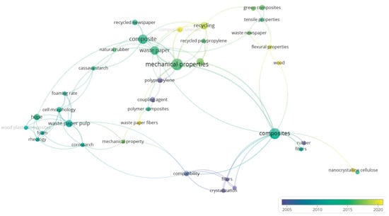 Keyword networking was performed using the software VOSviewer concerning the frequency and chronological time (Figure 4). The most incident cluster is mechanical properties, followed by composite(s), waste paper, and recycling. Regarding chronological time, the yellow clusters are the most recent ones, including recycling, wood, nanocrystalline cellulose, and flexural properties. This result indicates the relevance of recycling and mechanical properties topics (including flexural properties). Other properties needed to be identified, suggesting a gap in the literature that could be explored more in further research.