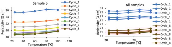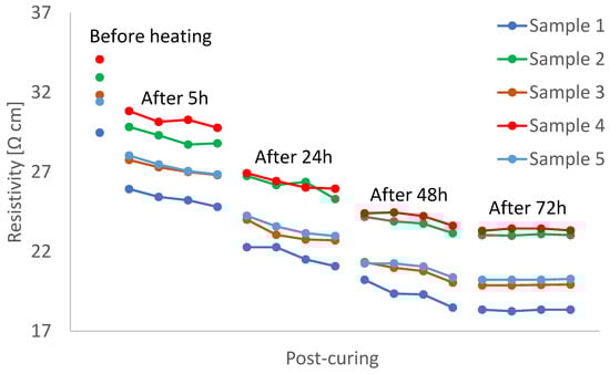 The current discussion is for measurements conducted with Procedure A from Section 2.3. For the five samples, uninterruptedly post-cured at 120 °C for 72 h, the measured electrical resistivities are presented in Figure 3. Each connected set of markers represents the resistivity change of a sample during an hour. The decreasing trend is clearly observed, indicating the continuation of the curing process. We argue that the way the samples were manufactured (industrial curing at 130 °C for 3 h) does not allow them to reach a high enough degree of cure since post-curing clearly changes material properties. In Section 4, we compare the behaviour of post-cured samples in the presented work with reported investigations in the literature [,]. We see that only after 72 h at 120 °C, the curves reach a steady state indicating that the final state of curing has been achieved.