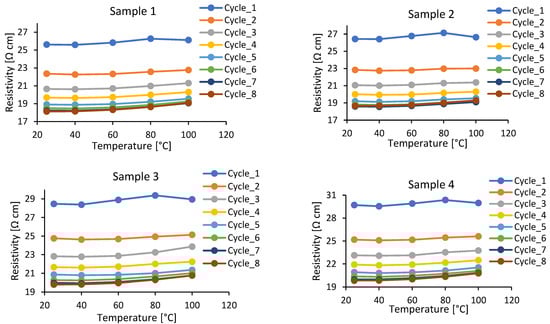 Change in electrical resistivity with the temperature at different post-curing cycles.