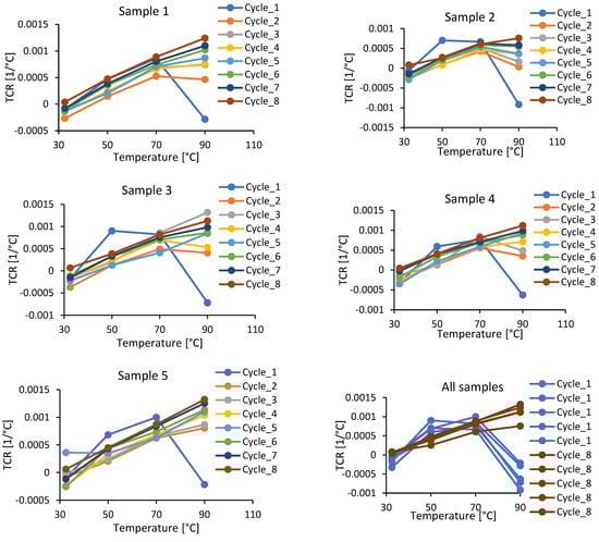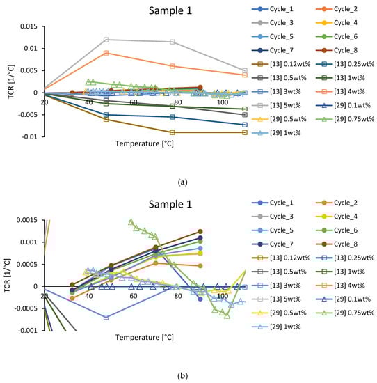In Figure 7, we compare TCR temperature dependencies. For our samples, TCRs exhibited maximums near 70 °C for initial cycles of post-curing, but were becoming steadily increasing monotonic dependencies at the end of post-curing. TCRs from [] exhibited not only maxima but also minima near 50–80 °C, demonstrating much bigger absolute TCR values (Figure 7a). TCRs from [] (Figure 7b) had values close to our study reaching zero values near 90 °C, similar to the cycle 1 dependence of the present study.