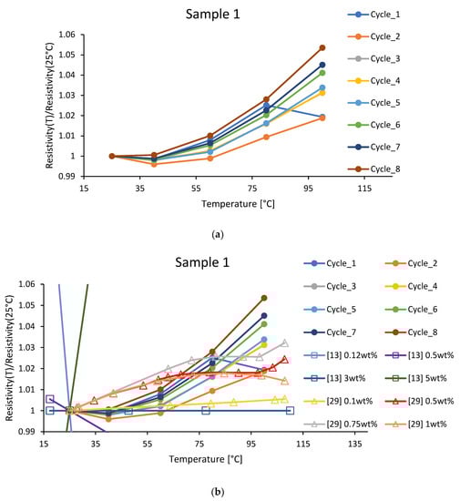 First, we compare temperature dependencies for resistivities. Both studies, [,], were conducted with MWCNTs. MWCNTs provide much higher resistivities than SWCNTs, by several orders of magnitudes higher [], and, thereby, cannot be compared directly. To overcome this problem, we have normalized resistivities by their value at 25 °C to observe not absolute values but trends. In Figure 6a, we present these dependencies for sample 1 in our study and Figure 6b we put results from [,] on top of them. While Gong et al. [] present a much wider scale of changes, beyond the limits of our plot, both with negative and positive slopes, Lasater and Thostenson data [] follow our results closely–note the resemblance between Lasater and Thostenson data curves for 0.5 wt.%, 0.75 wt.%, 1.0 wt.% and cycle 1 curve (blue) from our results, corresponding to industrially cured materials (no post-curing). All these curves have a maximum of around 80 °C, which we attribute to active post-curing following the measurements and shifting the results.