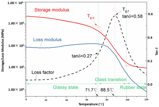 The viscoelastic behavior of adhesives and adhesive joints is characterized by the elastic modulus, viscous modulus, and loss factor determined by thermomechanical analysis (TMA/DMA). In thermomechanical analysis, the storage modulus appears at the initial temperature and indicates the elastic response of materials due to strong crosslinking between polymeric chains. While the loss modulus appears at the middle temperature, where the molecular mobility starts and represents the viscous response of a material. The balance between the elastic and viscous responses is represented by the tan delta (loss factor) [11].