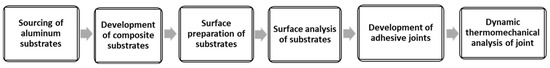 Adhesive bonding is the most efficient and durable method for assembling composite parts into metal parts [3,4,5]. To achieve a durable bond at an elevated temperature, efficient surface preparation for joining adherents must ensure the following features: contaminant removal, high surface energy, etc. Numerous surface pretreatments such as sandblasting, chemical etching, and anodizing are used for this purpose, as cited by Nasreen et al. [6,7]. After surface modification of composites and metals, their joints are developed with adhesives [8], their bonding performance could be assessed by the lap shear test, and their viscoelastic behavior with temperatures, time, and frequency could be determined using thermomechanical analysis [9,10].
