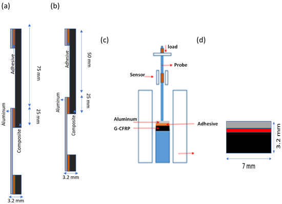 The adhesive joint was produced by sandwiching a thin layer of adhesive between the composite substrate and metal substrates. The whole setup was then left for curing at room temperature for one day followed by post-curing at 150 °C in the oven for 2 h. The thickness of the adhesive layer was maintained at 0.6 mm using constant loading. The dimensions of composite/metal adhesive joints were 7 mm × 7 mm × 3.2 mm in length, width, and thickness direction, respectively. Three replicates of each joint were produced as mentioned in Table 3.
