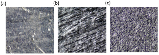 Comparison of surface textures of metals at 45X: (a) untreated, (b) abraded, and (c) abraded and anodized.