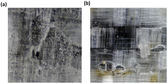 Figure 7 compares the surface texture of the composite surface after the peel ply treatment and the chemical etching methods. It was observed that the peel-ply fabric interacts with matrix materials, etches its surface macroscopically, and increases the surface area of the composite. However, some residue of the peel ply is left on the surface after treatment, which needs to be removed for better adhesion purposes [25,26].