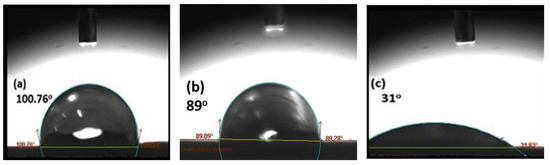 Figure 9 indicates the wettability results of the composite substrate after the surface pretreatment. The peel ply treatment on a composite surface added macroroughness but was hydrophobic, as shown in Figure 9a. Although, when the composite surface was chemically etched after peel ply removal, the contact angle was reduced to 43°. Therefore, the hydrophilicity increased due to the presence of microroughness, and the adhesion strength was improved.