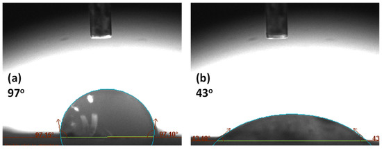 Comparison of contact angle results of the composite substrate at a magnification of 45X: (a) peel-ply treated and (b) peel ply removal followed by chemical etching.