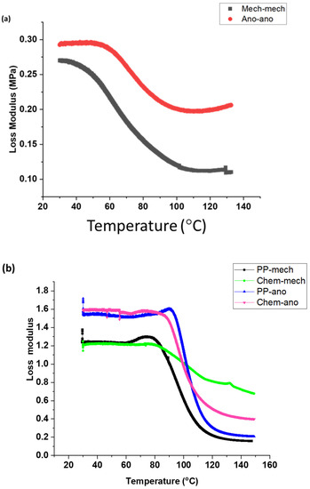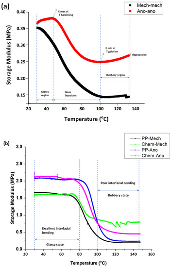 Compared to the PP-ano and PP-mech joints, the Chem-ano and chem-mech joints in Figure 10b, which involved chemically etching the composite substrates and treating the metal surface (abrading or anodizing), are more stable at high temperatures. This may be attributed to the elimination of the impurities, and a uniformly etched composite surface after chemical etching. As a result, the adhesive and composite could be retained micromechanically, increasing the composite’s stiffness and stability at high temperatures.