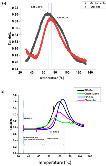 Figure 12a compares the tan delta (loss factor) of metallic bonded joints with the temperature ramp after surface modification. With the temperature rising, the tan delta increases in the glassy region, reaching a high value at a phase transition point, and then beginning to decline in the rubbery phase. The tan delta of composite/metal joint curves greater than one signifies poor interfacial bonding between adhesive and adherends, and the peak point of the loss factor (tan delta) curves indicates the glass transition temperature of the adhesive joints, after which the mechanical strength of the joint degrades sharply. The mechanically treated and anodized metal substrates used in ano-ano bonded joints have greater glass transition temperatures than the mech-mech joints. The tan delta of the ano-ano joint is 0.89 at 70 °C, which is less than the tan delta of the mech-mech joint. This is because the ano-ano joints showed low damping against dynamic forces.