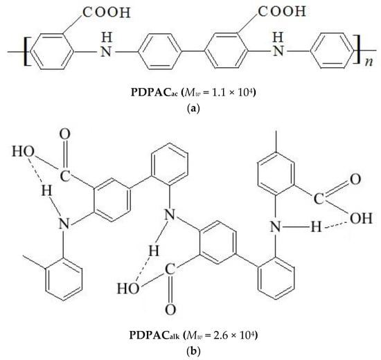 Polydiphenylamine-2-carboxylic acid was prepared using oxidative polymerization of DPAC in the homogeneous acidic medium (PDPACac) and the heterophase system in an alkaline medium (PDPACalk). According to the GPC, in NH4OH (pH 11.4), the molecular weight reached Мw = 2.6 × 104 [39], whereas in 5 М H2SO4 (pH 0.3), the molecular weight is Мw = 1.1 × 104 [40].