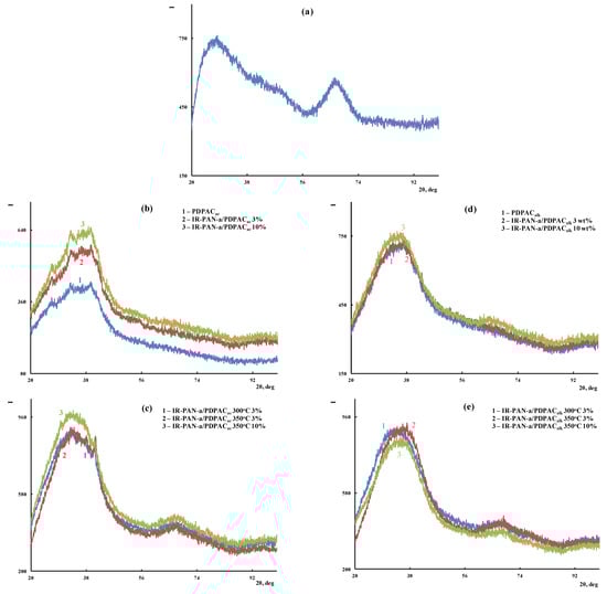 XRD of IR-PAN-a (a), PDPAC and IR-PAN-a/PDPAC (b,d), and IR-PAN-a/PDPACIR (c,e), prepared in an acidic (b,c) and an alkaline medium (d,e).