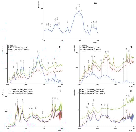 Attenuated total reflection (ATR) FTIR spectra of IR-PAN-a (a), PDPAC and IR-PAN-a/PDPAC (b,d), and IR-PAN-a/PDPACIR (c,e), prepared in an acidic (b,c) and an alkaline medium (d,e).