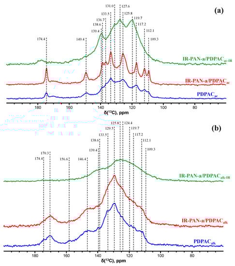CP/MAS 13C NMR spectra of PDPAC, IR-PAN-a/PDPAC, and IR-PAN-a/PDPACIR prepared in an acidic (a) and an alkaline medium (b).
