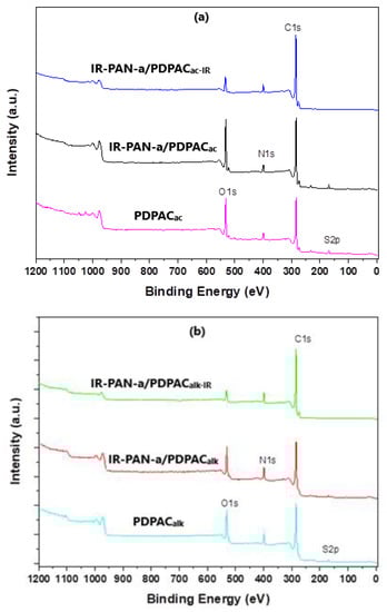 XPS survey spectra of PDPAC, IR-PAN-a/PDPAC, and IR-PAN-a/PDPACIR prepared in an acidic (a) and an alkaline medium (b).