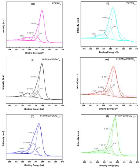 C1s XPS spectra of PDPAC (a,d), IR-PAN-a/PDPAC (b,e), and IR-PAN-a/PDPACIR (c,f) prepared in an acidic (a–c) and an alkaline medium (d–f).